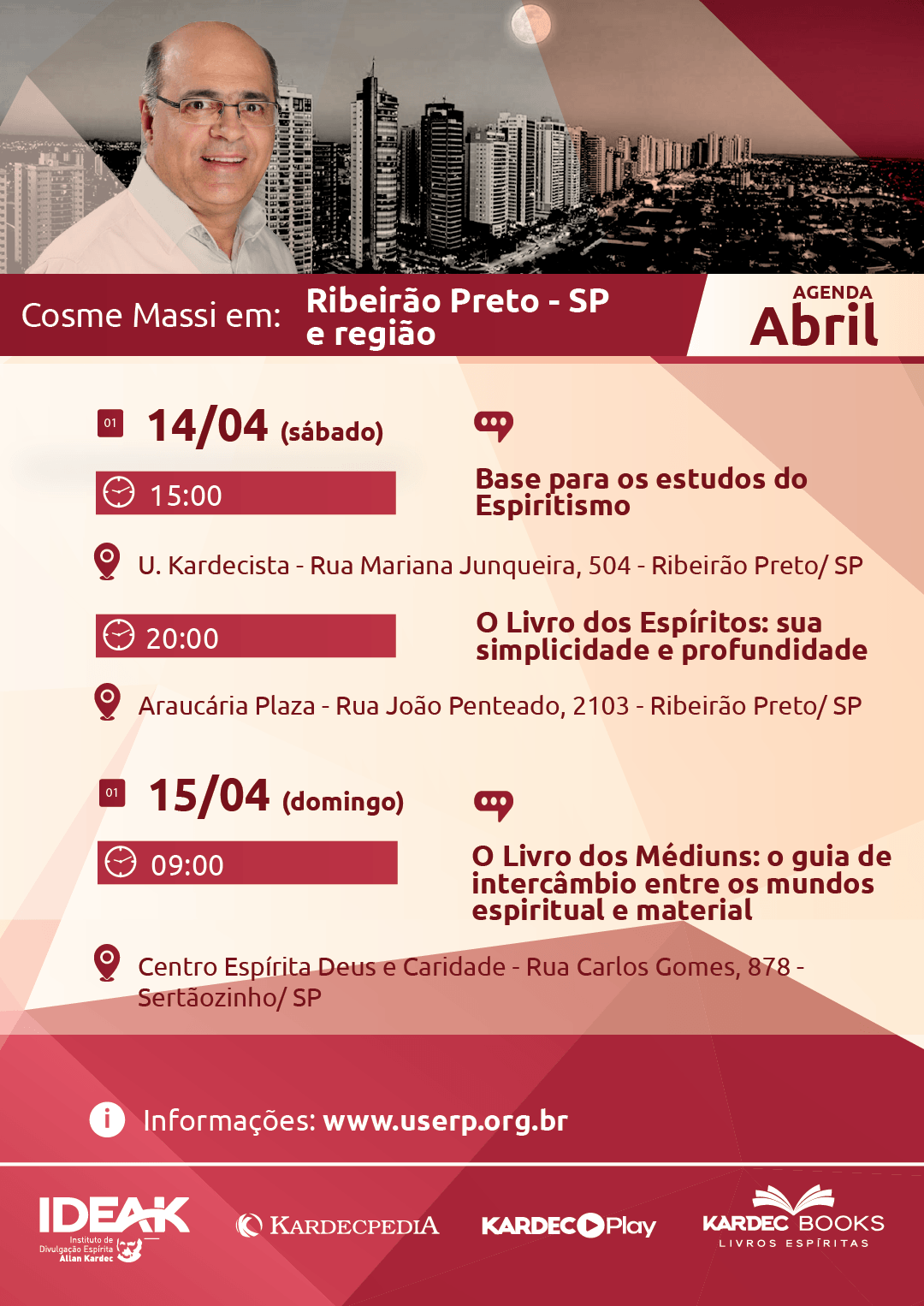 Todos os temas das palestras você encontra na KARDECPEDIA, plataforma online, sem custos e interativa. Confira o conteúdo das obras deixadas por Allan Kardec.