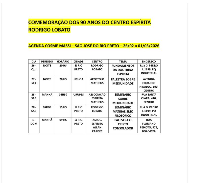 Local: Associação Espírita Allan Kardec - Rua Floriano Peixoto, 975 - Boa Vista - São José do Rio Preto / SP.